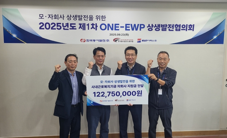 2025년 9월 23일(화) 10시, 한국동서발전(사장 권명호) 본사 7층 임원회의실에서 2025년 제1차 ONE-EWP 상생발전협의회를 개최하였습니다. 이번 협의회에서는 모·자회사 간 상생발전, 안전한 일터 조성, 공동이익 증진을 위한 주요 안건들이 논의되었으며, 그 일환으로 2025년도 사내근로복지기금 자회사 지원금이 전달되었습니다.
