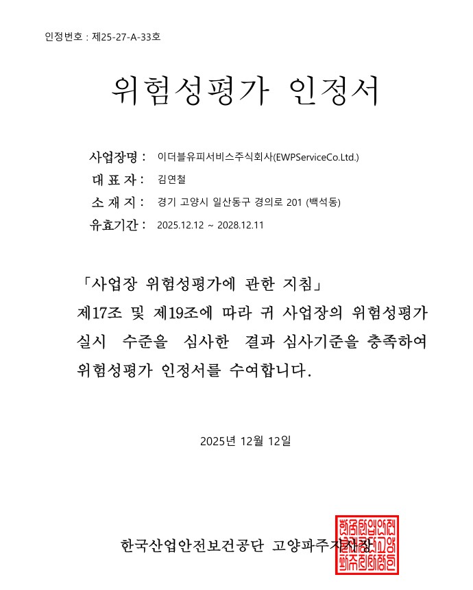 제목 2025년 위험성평가 우수사업장 인정서(일산사업소)